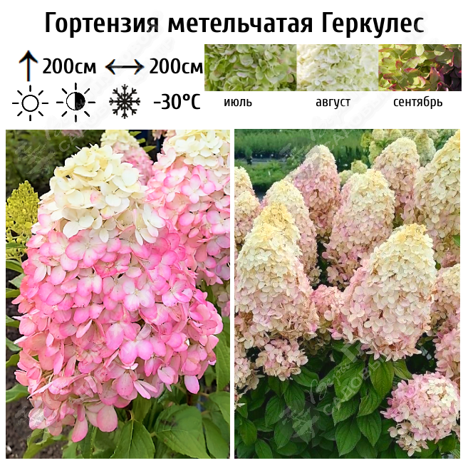 Стерильные цветки собраны в конусообразные соцветия на верхушках побегов. Соцветия очень крупные, длиной до 40 см, лимонно-зеленые, белоснежные в полном расцвете с вербовидно-зелеными кончиками, розовые к концу лета.